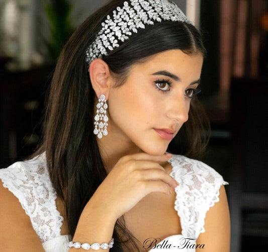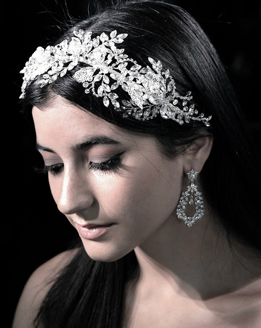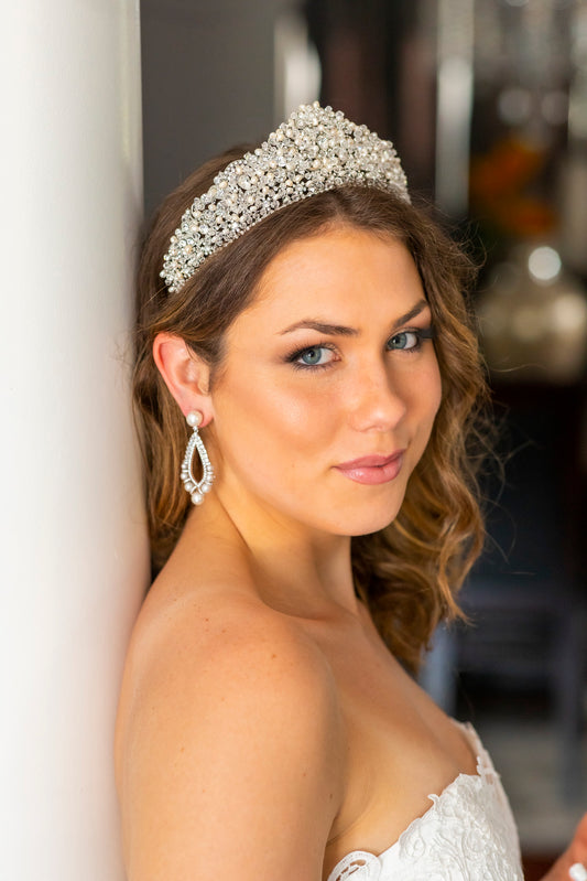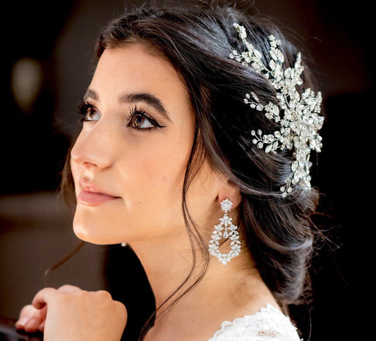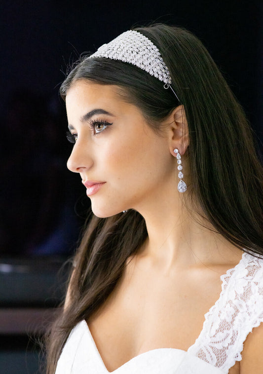 Absolutely. Our bridal earrings are designed to pair effortlessly with tiaras, headbands, and veils—balancing your entire bridal look.