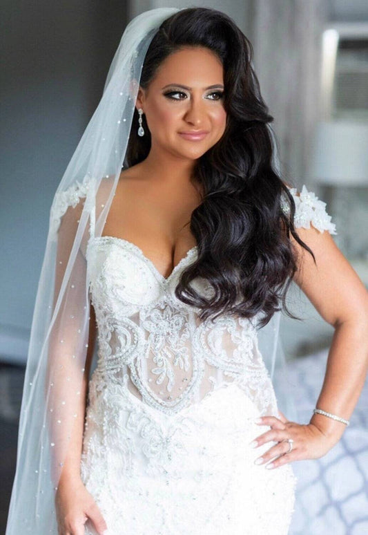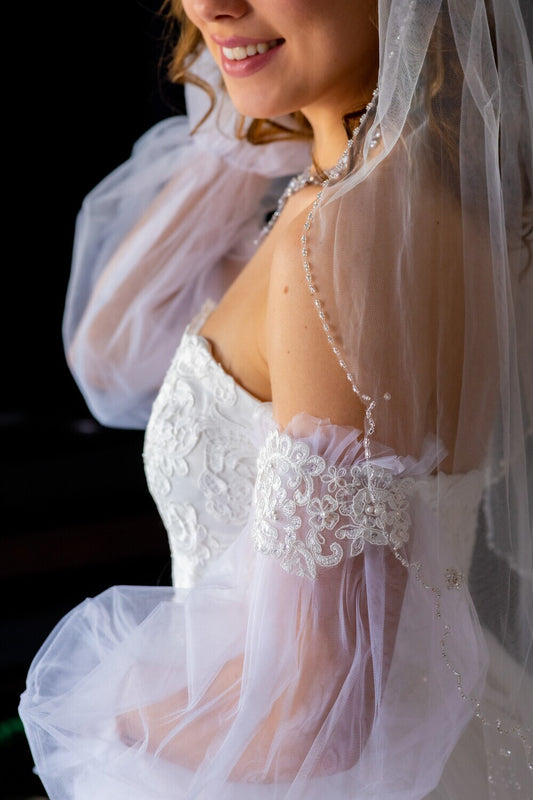 Our floor length veil collection includes hand-finished lace appliqués, pearl embellishments, and sheer minimalist designs in classic tones like white wedding veil or soft ivory. Each piece drapes effortlessly to complement gowns of all silhouettes—from sleek columns to dramatic ballgowns.