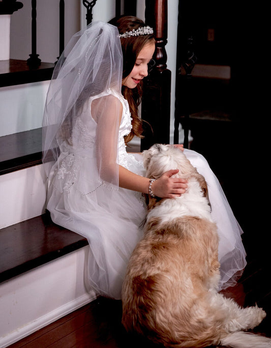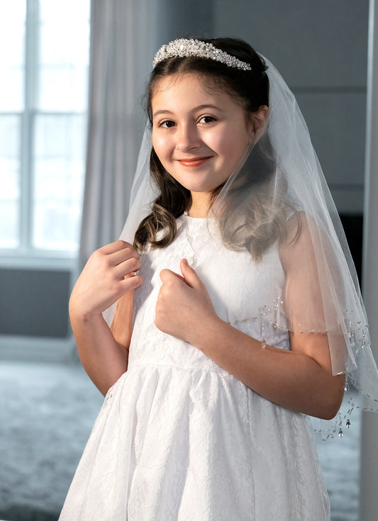 Visit Bella-Tiara's beautiful collection of First Communion Accessories. Communion tiaras, communion headpieces, communion lace veil and communion crystal edge veil.