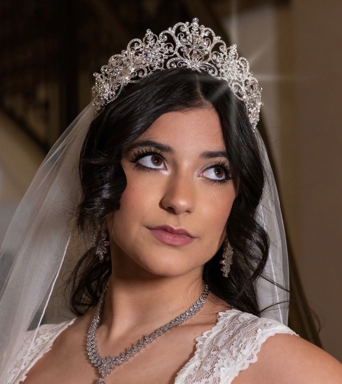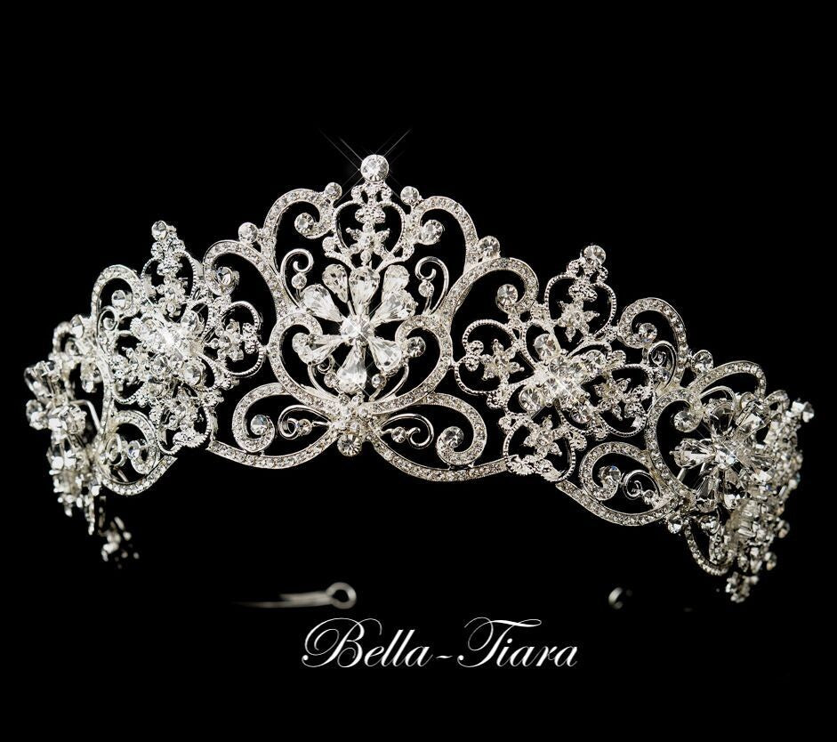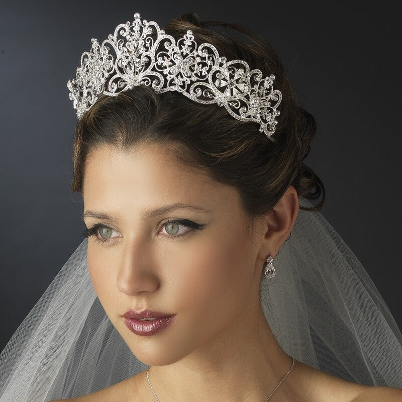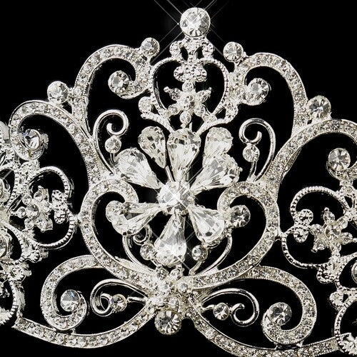This absolutely stunning bridal tiara with decorative floral sparkling rhinestones is sure to sparkle up your wedding day! Curling decorative design encrusted with sparkling rhinestones this makes a fabulous piece. Ending hoops make this piece easy to fasten with pins into any up-do!