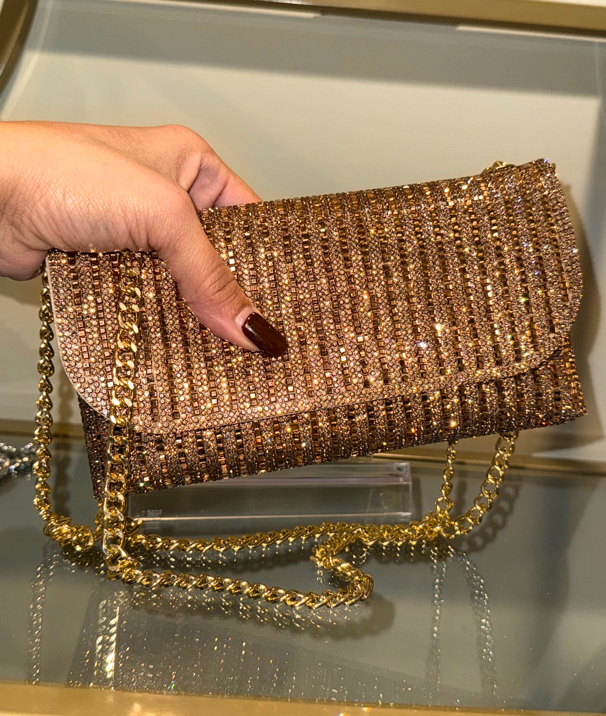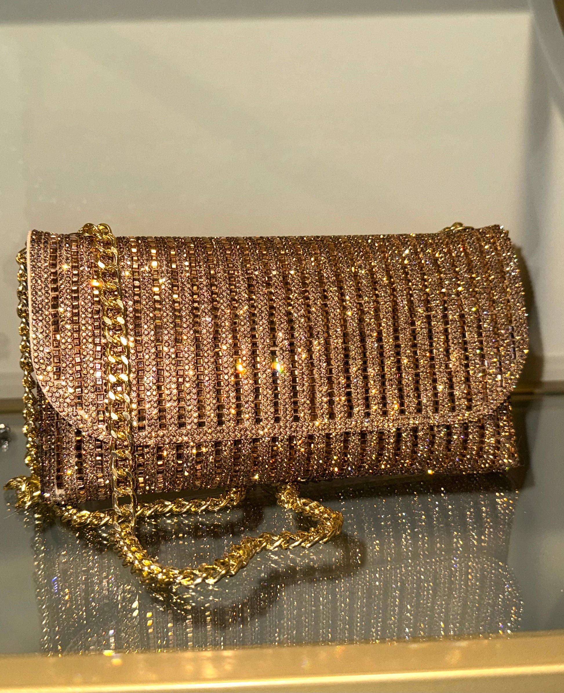 You will Absolutely fall in love with our Amy gold crystal purse. Dazzling and elegant swarovski crystal gold/champagne clutch purse is perfect for all your essentials, soft and elegant with gold chain crystal all around, perfect for any size cell phone