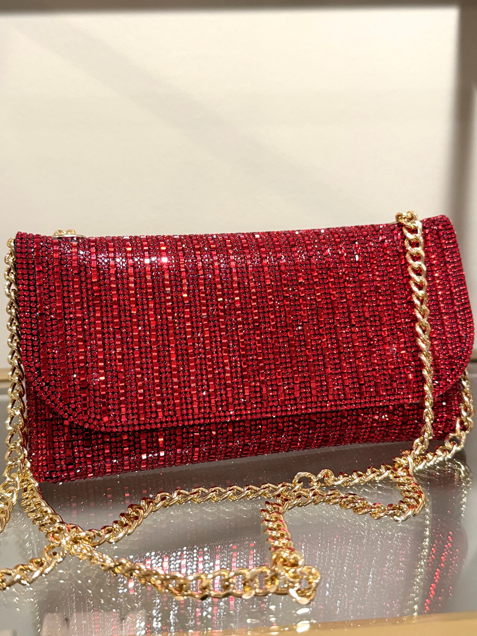 You will Absolutely fall in love with our Amy crystal purse. Dazzling and elegant swarovski crystal red clutch purse is perfect for all your essentials, soft and elegant with gold chain crystal all around, perfect for any size cell phone