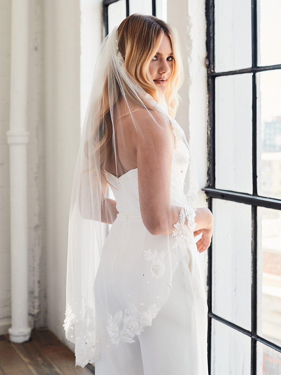 Another beauty added to our collection, This veil is made of soft English tulle and is decorated with flower lace edging.