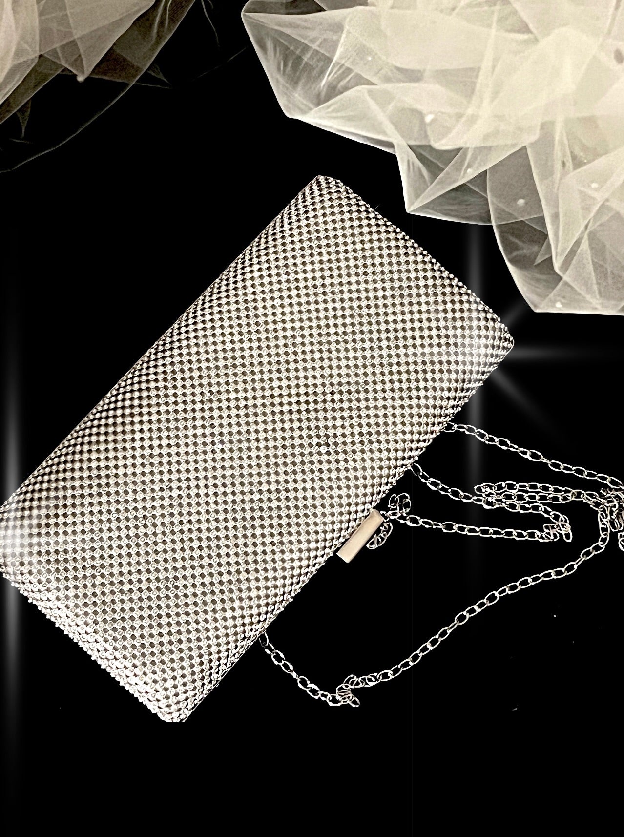 elegant crystal clutch purse perfect for all your essentials, elegant removable chain satin lined. crystal all around, perfect for any size cell phone