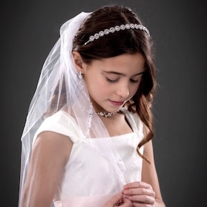 ***add any of our beautiful crystal or lace edge communion veils to complete her look