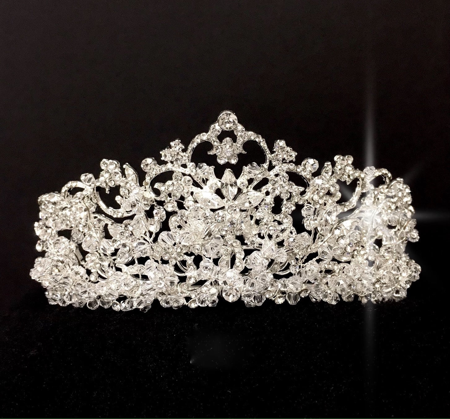Truly no words to describe how royal and beautiful this tiara is. A Timeless Classic design accented with romantic swirls and beaded Swarovski crystal.