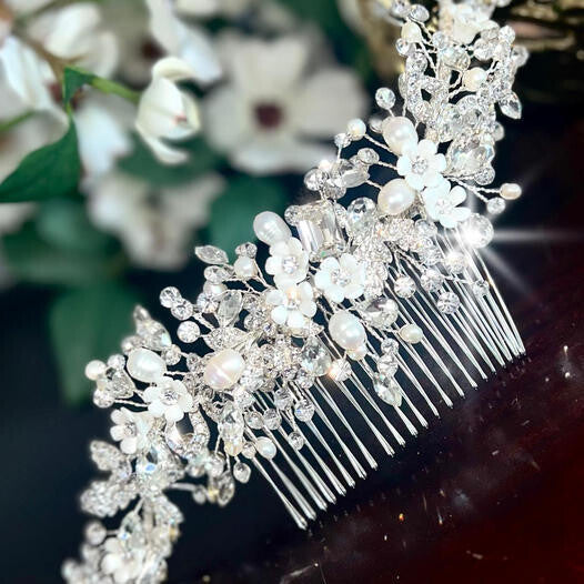 Words cannot describe the beauty and elegance of this bridal comb, wire frame to adjust to your needs with dazzling swarovski vine crystals, off white pearls, and beautiful ceramic / porcelain flowers