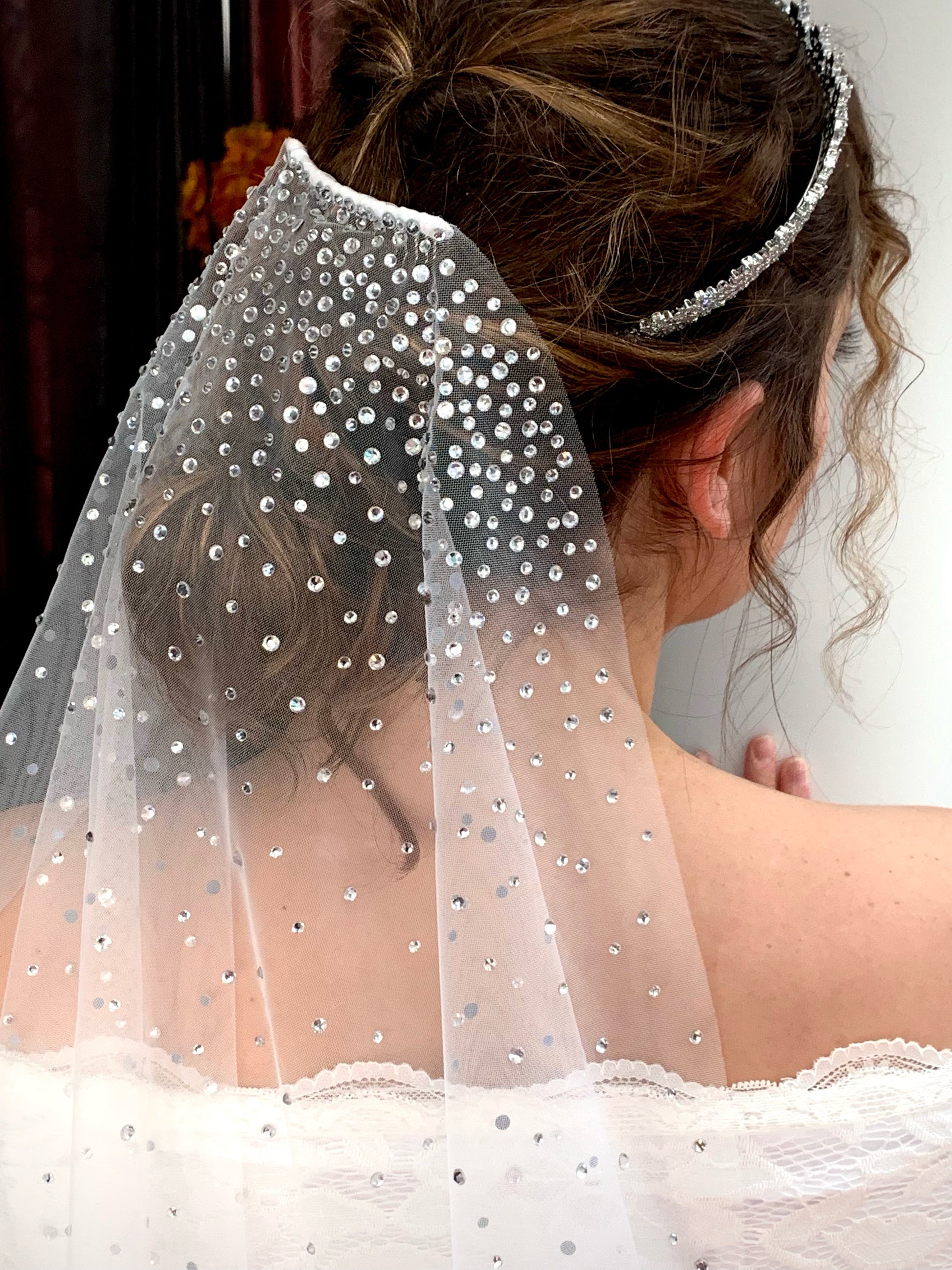 New to our handmade collection - Beautiful handmade soft illusion veil with heavy scattered small and medium Swarovski crystals on top with an ombre effect to the bottom
