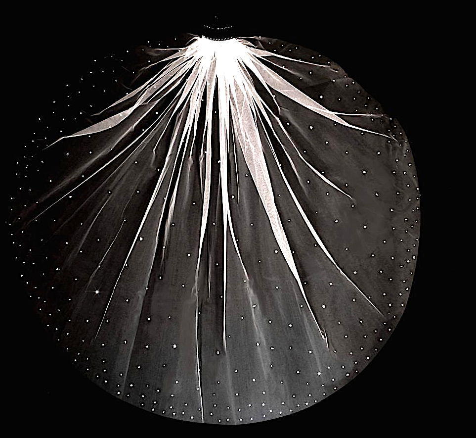 Exuding elegance and charm, beautiful veil adorned with stunning Swarovski crystals and features a delicate tulle fabric. Attached to a 3.5" comb, this handmade veil is the perfect accessory for the modern, romantic bride. Don't miss out on this top-selling item!
