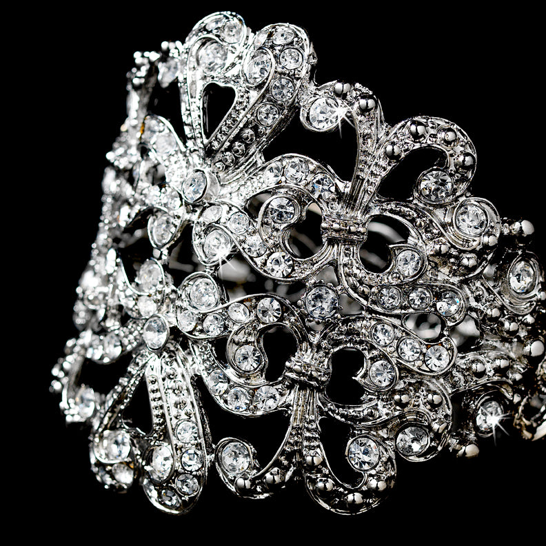 A stunning addition to your vintage-inspired wedding, prom, or homecoming. The bracelet opens with a hinge to fit average wrists and for easy on and off.