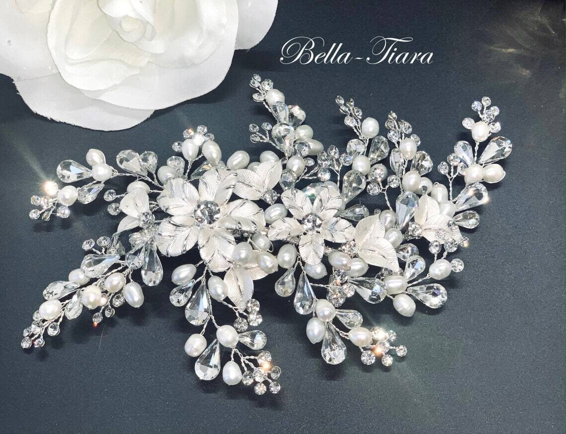 Glamour, romance and elegance combined in one absolutely stunning design, part of our royal collection wire frame to adjust to your needs with dazzling swarovski vine crystals elegant off white light ivory pearls and beautiuful enamel painted flowers.measures approx 8" long x 3.5 wide