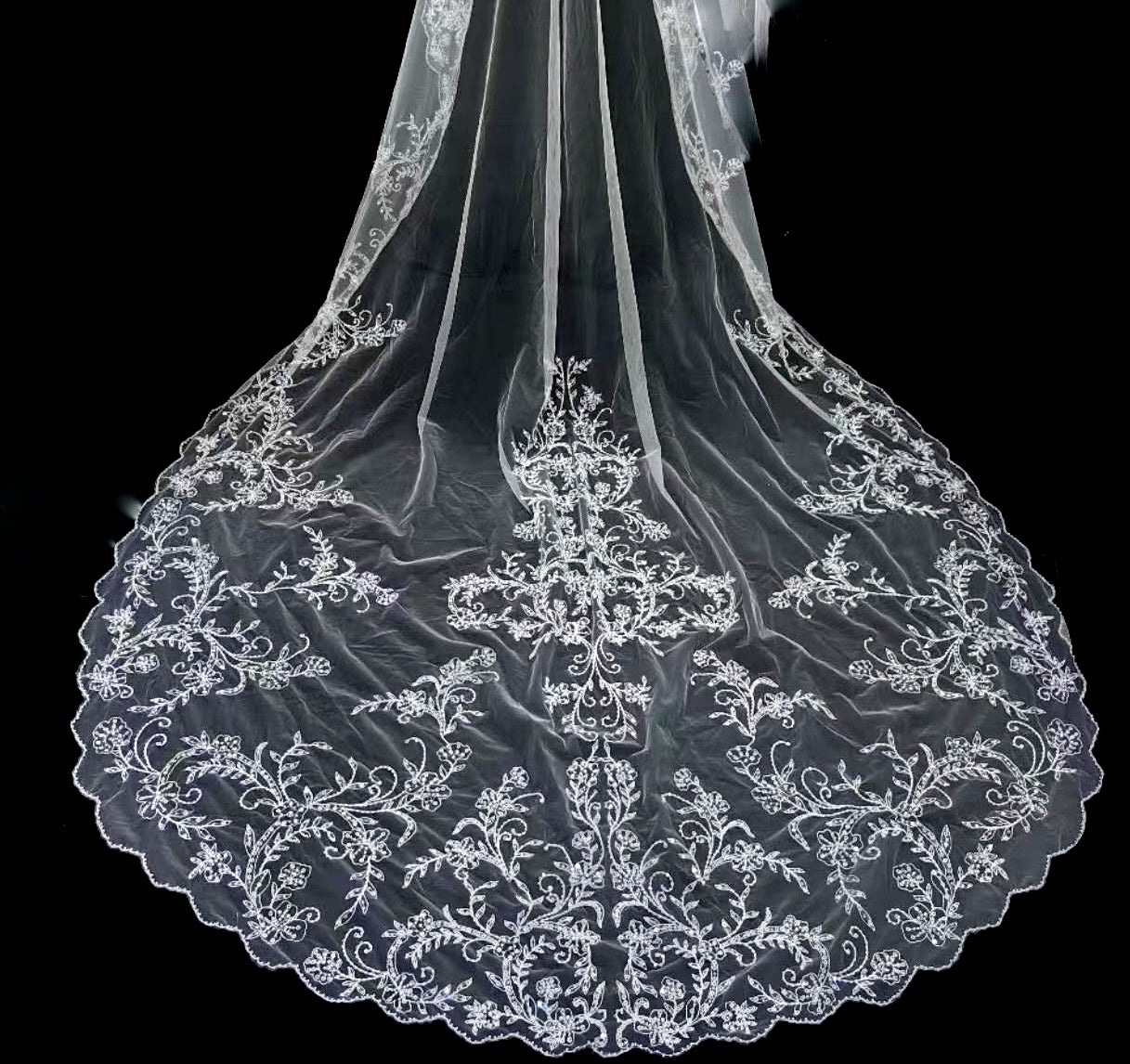 mesmerizing, exquisite, elegant beaded embroidred crystal and sequins wedding veil, scalloped beaded edge