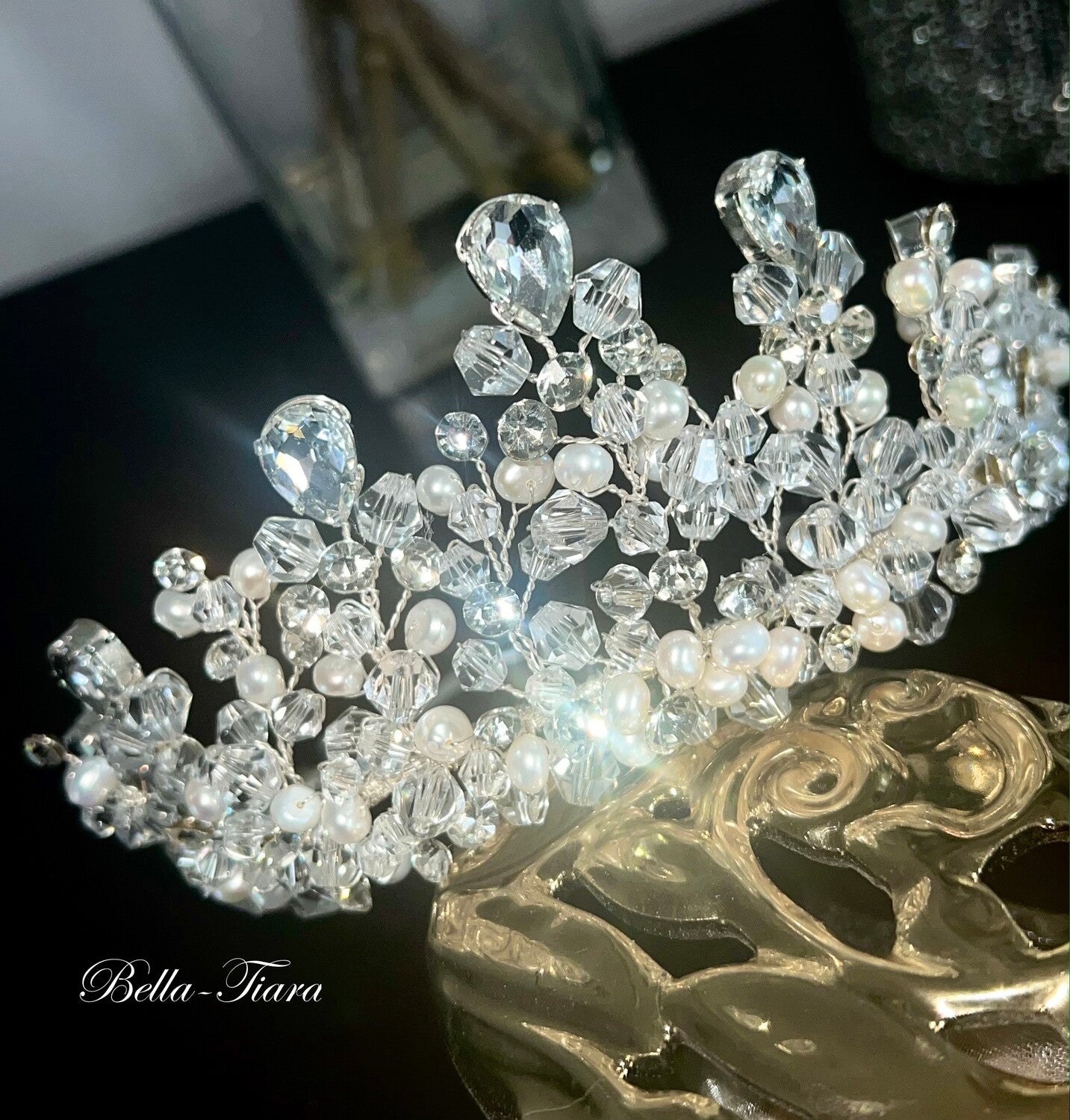 Dazzling, beautiful and romantic Freshwater off white pearl crystal tiara on flexible band for confort, with hoops on each end for bobbie pins, perfect for the classic bride with a modern twist. tiara measure approx 2.25 high just beautiful.