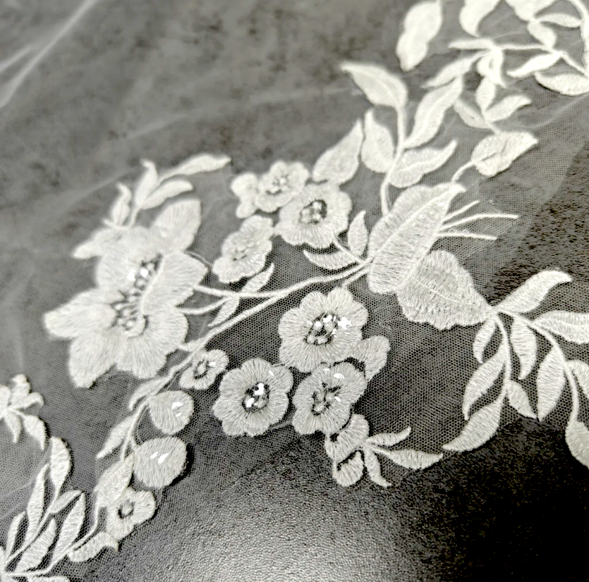 Absolutely stunning new to our collection, The lace features a subtle sprinkling of crystals and is meticulously trimmed to highlight each detail of the beautiful appliqués. luxurious 2 rows of flower lace
