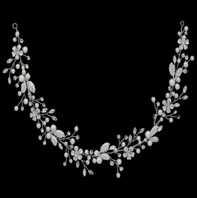 New beautiful swirl floral pearl, rhinestone and crystal communion headband, white enamel flowers, design approx 1/2" and spams approx. 12 long.