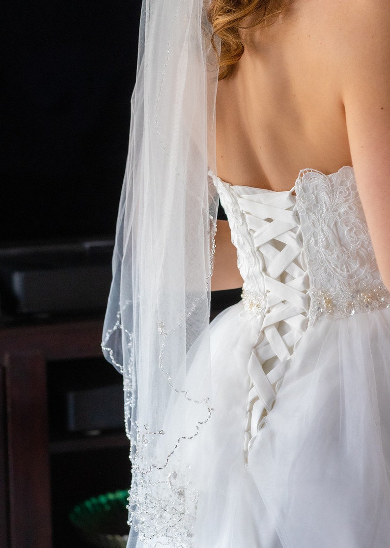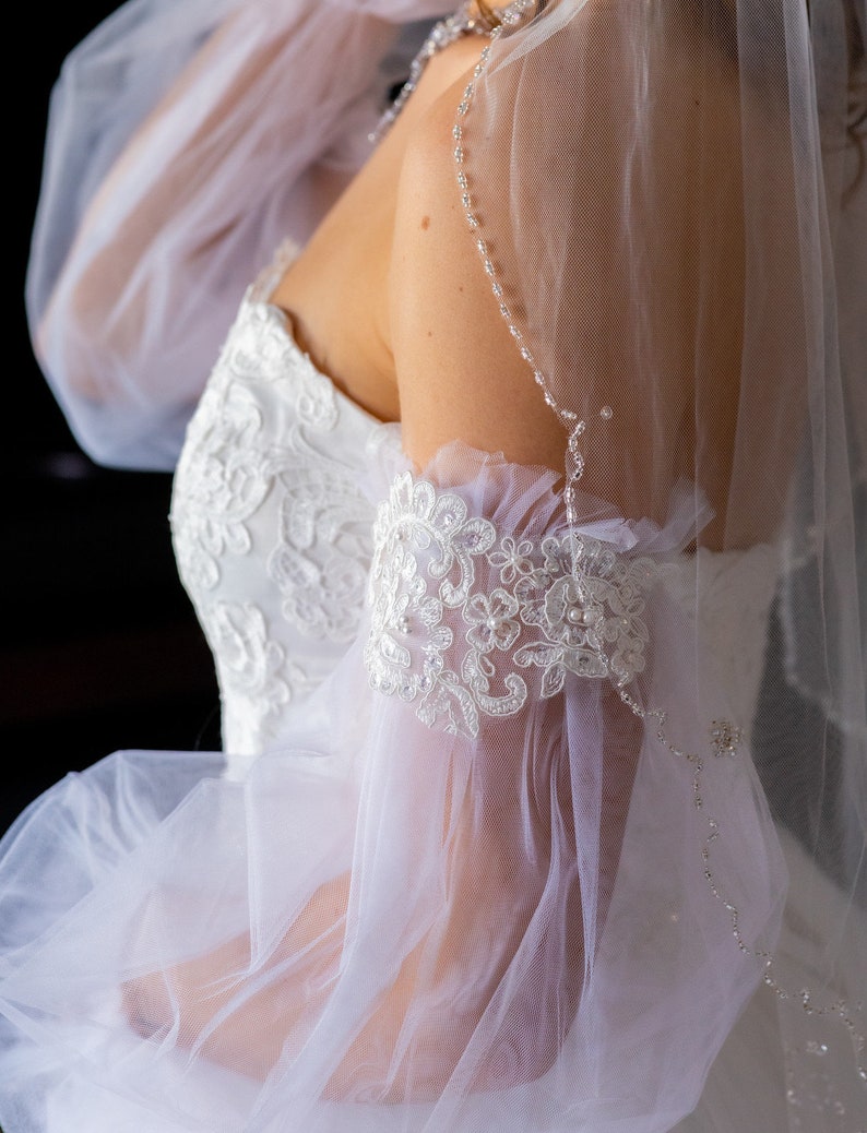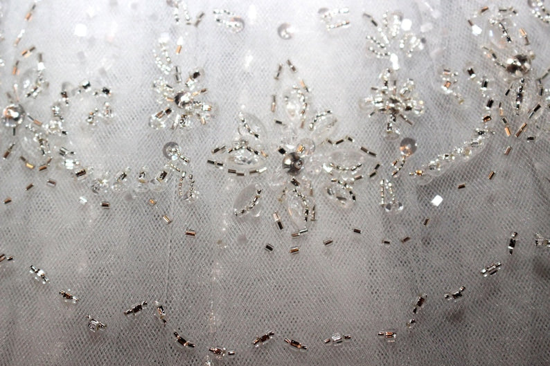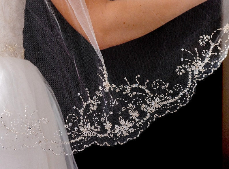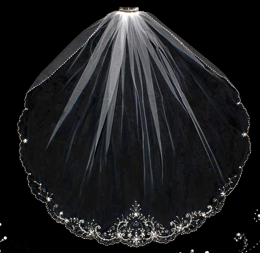 our best selling wedding veil now comes in a communion length, beautiful beaded scalloped edge veil adorned with rhinestone, marquise cut crystals, and bugle beads