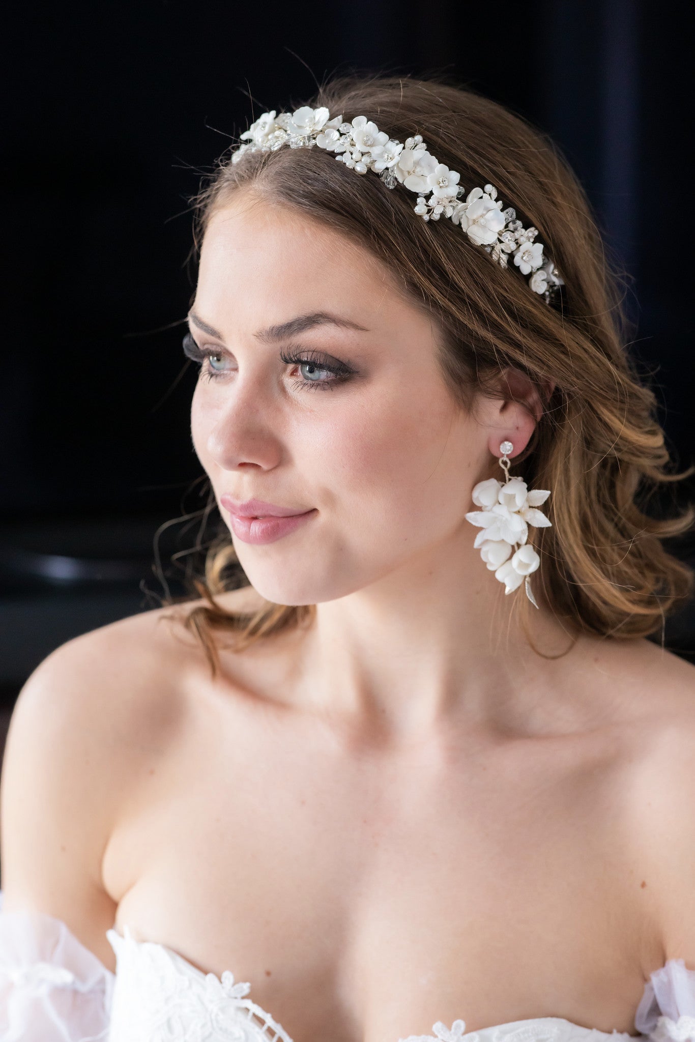 New beautiful swirl floral pearl, rhinestone and crystal accented with white enamel flowers, design 3/4" high great elegant size and spams approx. 12" long on flexible band, could be worn flat, elevated or around a bun