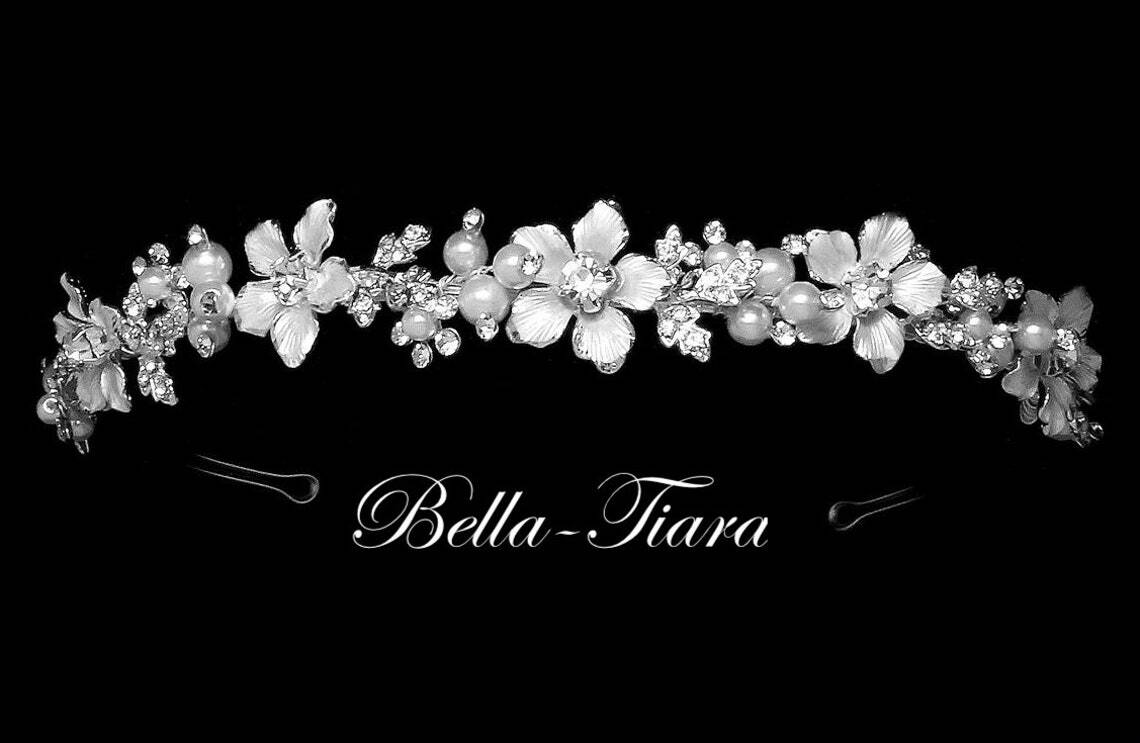 New beautiful swirl floral pearl, rhinestone and crystal communion headband, white enamel flowers, design 3/4" high great elegant size and spams approx. 12" long