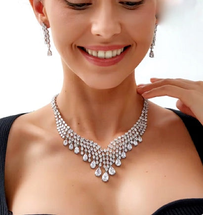 A red carpet beauty. Beautiful a must have and new to our collection. Dramatic bold collar crystal drops V style with the highest simulated diamond AAA CZ , a statement necklace perfect for that special night out.