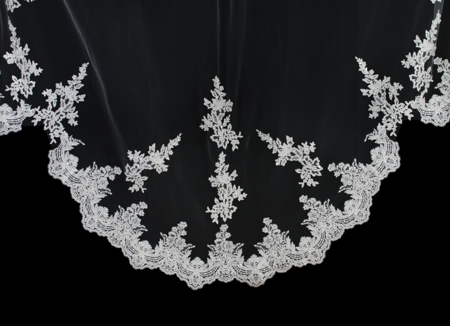 This beautiful, couture piece features a lace trim and five large scallops adorned with rhinestones and beads on a stunning, corded french lace. With a regal length of 130" x 108" wide this veil exudes a truly majestic feel fit for a princess.