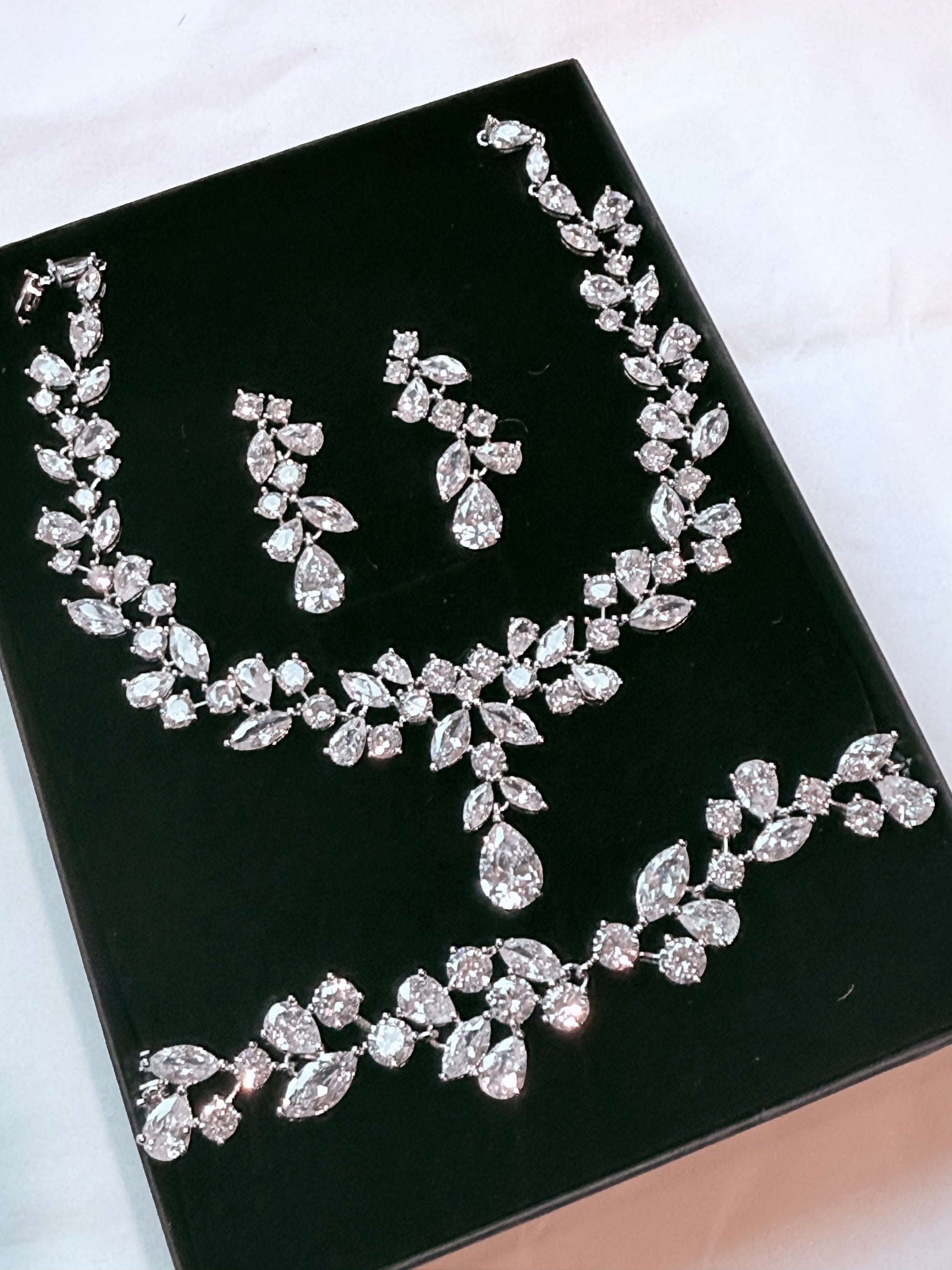 An amazing display of cubic zirconias, this sparkling beauty is the perfect piece for added glamour to your wedding. Beautiful vine drop necklace set.