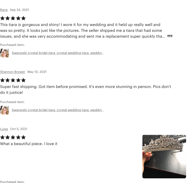 I absolutely love my tiara! The staff is super friendly and responsive, 10/10 recommend. Thank you!