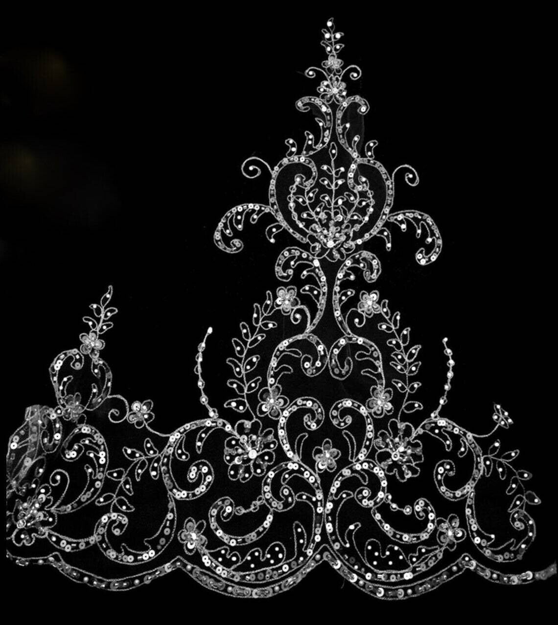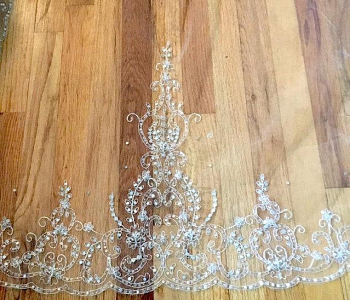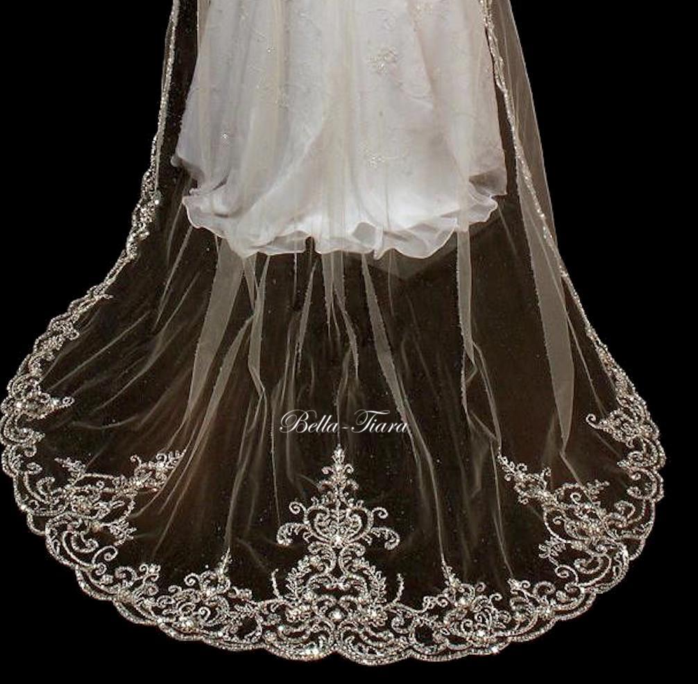 Beautiful now in regal length romantic vintage inspired handmade beaded edge veil adorned with sequins, crystals, silver embroidery and tiny tiny pearls.