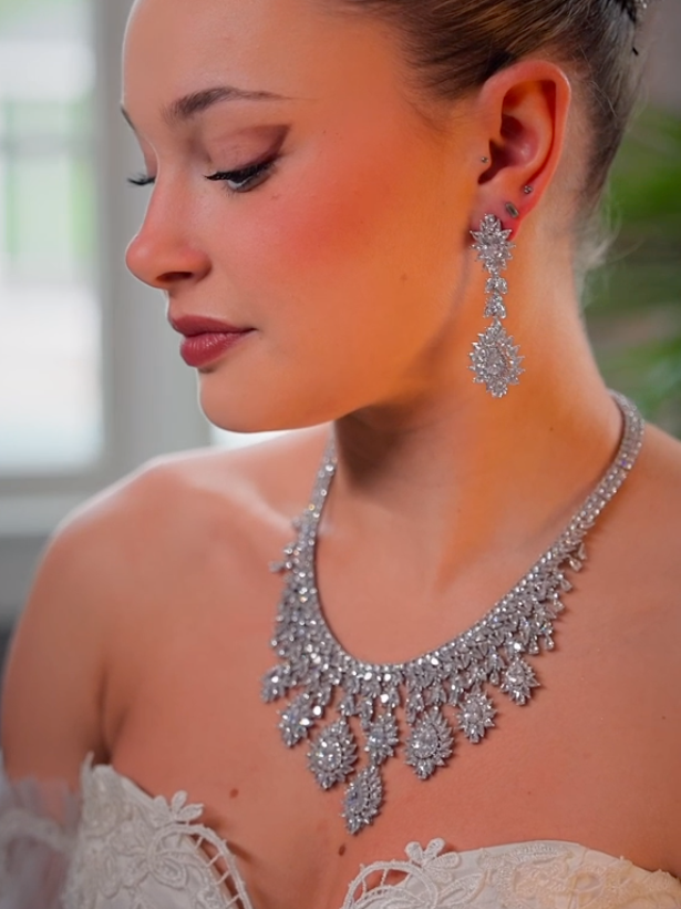 This exquisite high end jewelry set boasts heirloom quality. The statement bridal necklace set shines with dramatic highest AAA CZ crystals and features elegant drops that will elevate any special occasion. The bold and dazzling pierced earrings measure 2 inches in length.