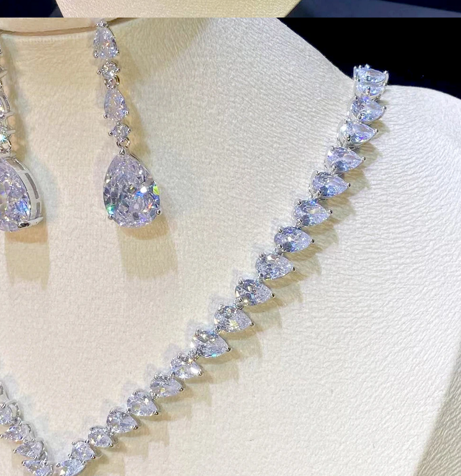 An amazing display of cubic zirconias, this sparkling beauty is the perfect piece for added glamour to your wedding or any special occasion, Beautiful bold statement elegant drop necklace set.