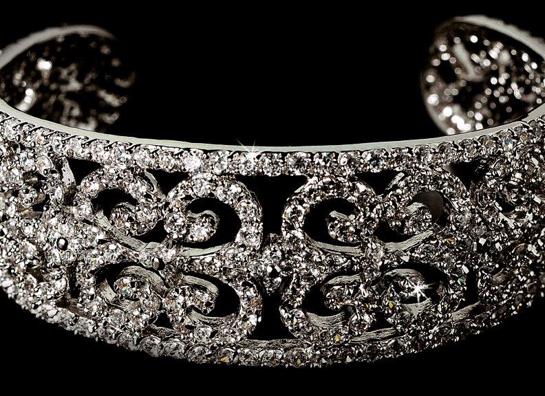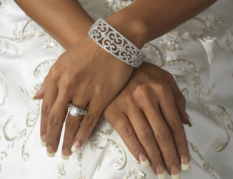 This vintage inspired bangle bracelet features a delicate scroll pattern that is fully coated with luminous clear cubic zirconia and set in fabulous antique silver. This glamorous piece is perfect for weddings, proms or any formal affair.