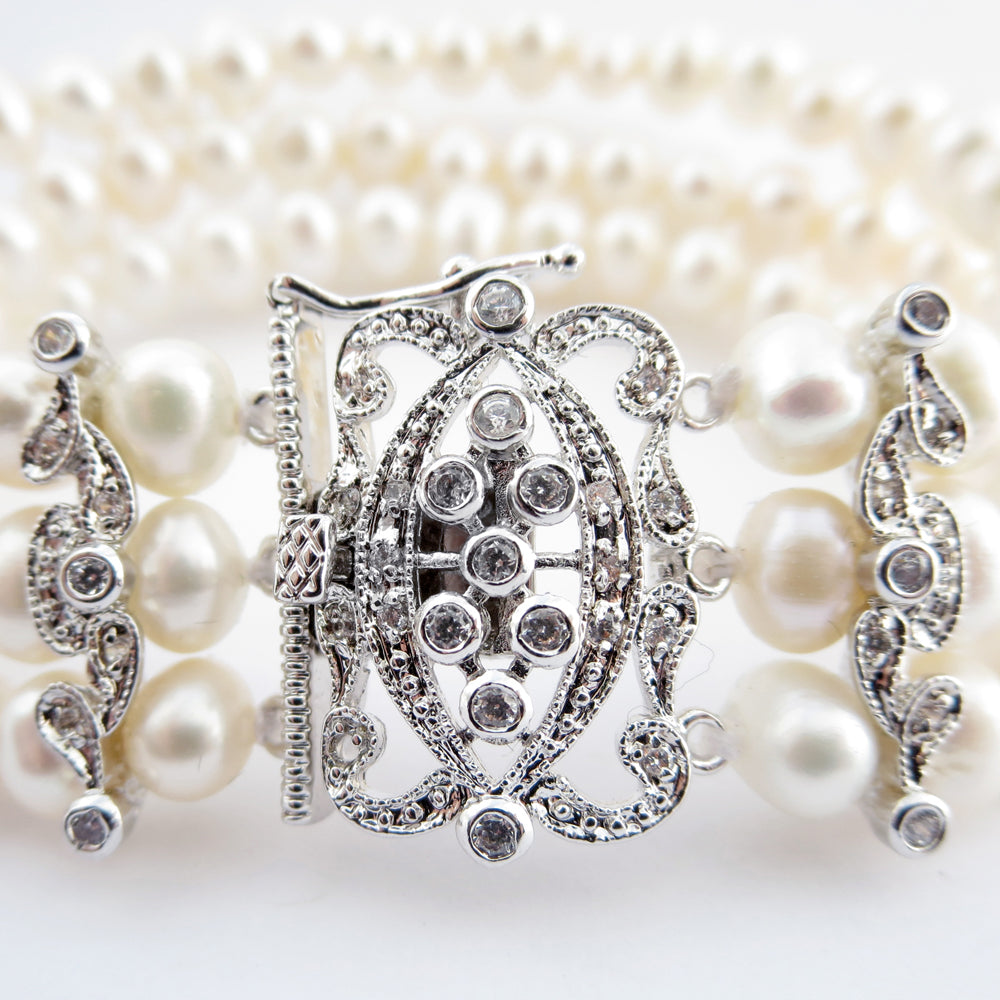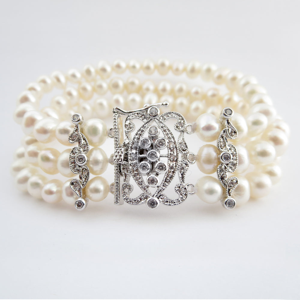 This vintage-inspired bracelet features rhodium ornaments with intricate sparkling rhinestone encrusted designs. Three strands of luminous freshwater pearls will stretch to fit most wrists. Great for your vintage-inspired wedding.
